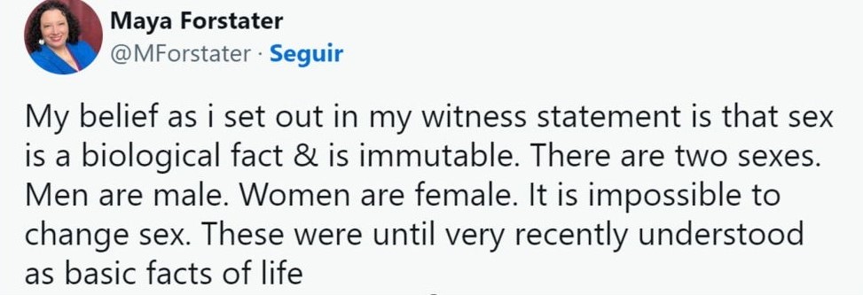 Traduccción: Mi creencia, tal como testifiqué en mi comparecencia, es que el sexo es un hecho biológico e inmutable. Hay dos sexos. Los hombres son machos. Las mujeres son hembras. Es imposible cambiar de sexo. Esto ha sido, hasta hace muy poco, hechos básicos de la vida ampliamente comprendidos. Artículo 19 de la Declaración de … Leer más