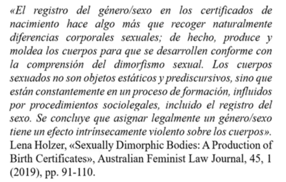 Lena Holzer, otra teórica del pensamiento woke, lleva sus ideas a la irracionalidad más extrema cuando afirma en su Tesis Doctoral titulada «El binario de género en el derecho internacional«, galardonada con el Premio SNIS 2022 y el Prix Senior Maurice Chalumeau 2023, que las diferencias anatómicas que distinguen a varones y mujeres son en realidad el resultado de los certificados civiles de nacimiento en donde se inscriben a los recién nacidos como varones o mujeres.